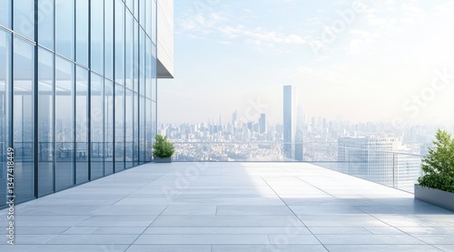 Empty rooftop terrace overlooking a cityscape. Modern, minimalist, and clean design