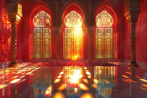 Empty room in Arabic style. Realistic spacious 3d Arabic room with large windows light shines through the window