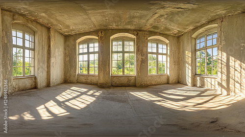 Empty room with concrete floor and diagonal shadows cast from sun light 3d render illustration