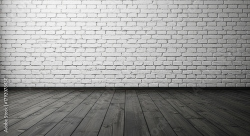 Empty room with white brick wall and dark wooden floor, Interior, White wall, Texture