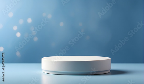 Empty round cylinder platform podium for product or cosmetics presentation on blue background with bokeh