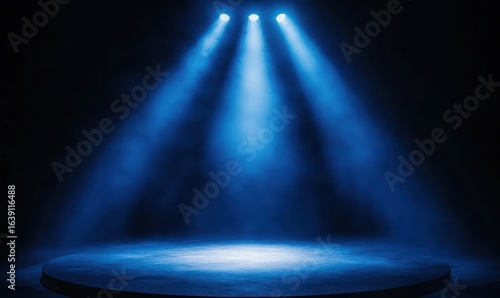 Empty round stage illuminated by three bright blue spotlights in a dark smoky environment creating a dramatic and focused atmosphere
