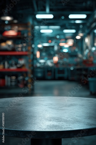 Empty round table in front of blurred workshop background industrial setting product display mockup