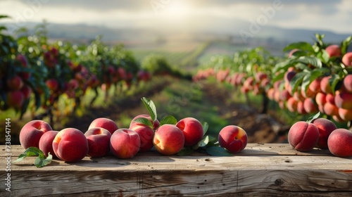 Empty rustic old wooden board table copy space with peach trees or an orchard in the background. Some ripe fruits are on the desk. Product display template.