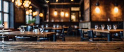 Empty rustic wood table and blurred soft light table in restaurant with bokeh background, product display template.Business presentation