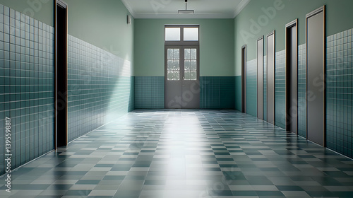 Empty School Hallway With Green Walls And Tiled Floor