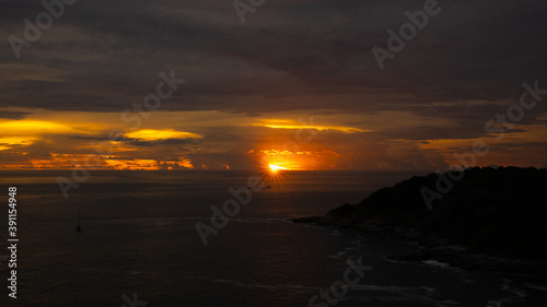 Empty sea and traditional boat on beach background at sunset in evening or sunrise in morning with copy space .Summer vacation and tourist concept . Phuket, Thailand