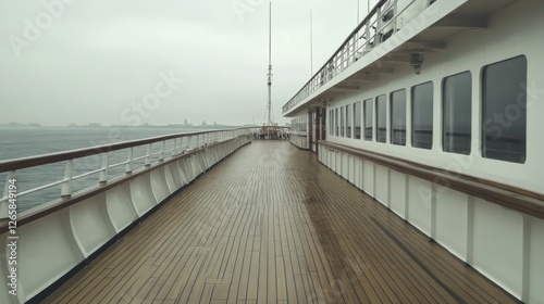 Empty ship deck, rain, misty day, ocean view, travel, calm