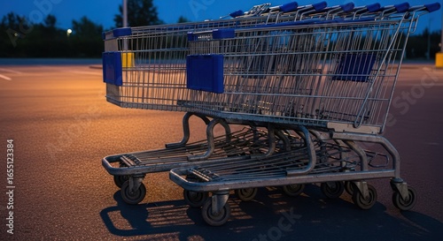 Empty shopping carts lined up on a parking lot at twilight