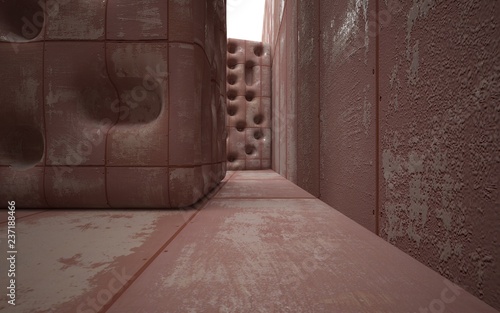 Empty smooth abstract room interior of sheets rusted metal and gray concrete. Architectural background. 3D illustration and rendering