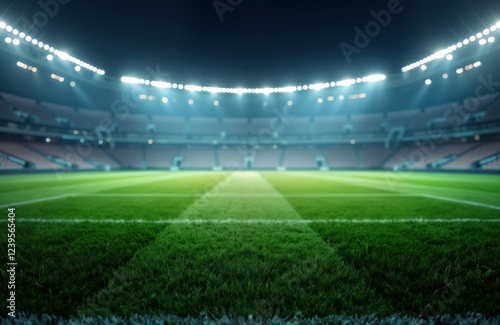 Empty soccer stadium at night. Bright stadium lights illuminate green field. No people are visible in stands. Focus is on vibrant green grass. Scene evokes sense of anticipation for game.