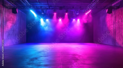 empty space illuminated by vibrant pink and blue stage lights, creating futuristic atmosphere. promoting events, concerts, nightclubs. abstract background for posters and banners.