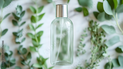Empty spray bottle surrounded by eucalyptus leaves on marble. Product photography for cosmetic packaging