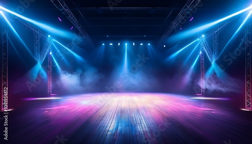 empty stage for shows with neon lighting and haze in tilted angle