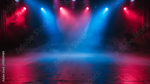 Empty Stage Lit by Red and Blue Spotlights with Smoke