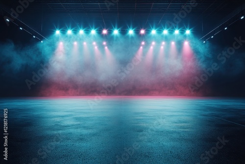 Empty stage with blue and pink lights, smoky atmosphere. Ideal for concert, event, or music backgrounds, showcasing dramatic lighting.