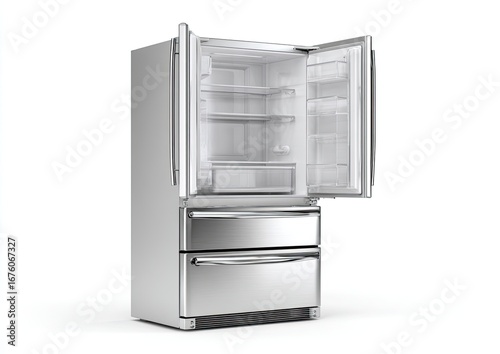 Empty stainless steel refrigerator, doors open