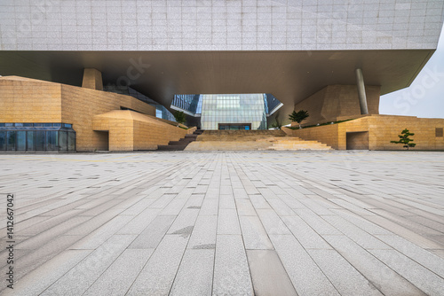 Empty stone floor plaza leading to a large modern architectural building exterior.