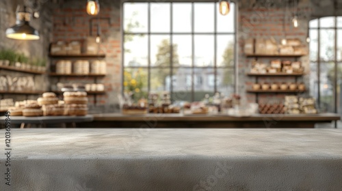 Empty stone marble table top in blurred bakery background. Blank nature textured rock desktop for product display in abstract blurred food shop backdrop