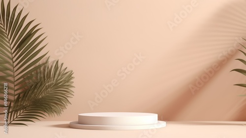 Empty stone pedestal with green leaves modern background. Product display design, mockup template