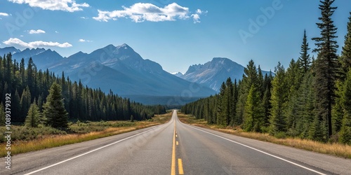 Empty stretch of asphalt road running parallel to a mountain range with a clear blue sky above and pine trees in the foreground, mountain view, road to nowhere, serene atmosphere, empty highway