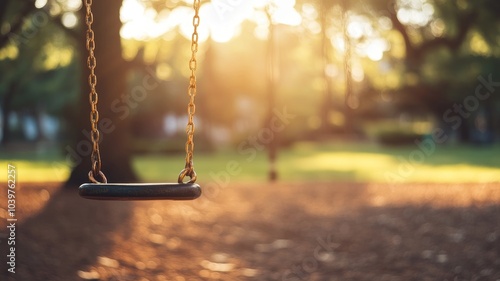 Empty swingset in tranquil park during sunrise, creating serene and nostalgic atmosphere