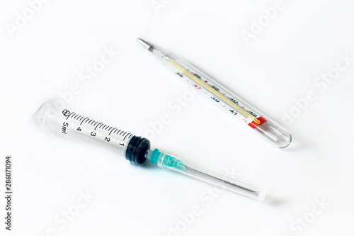 Empty syringe and thermometer closeup isolated on white background. High resolution. Injection. Vaccination. The medicine. Medical procedures and procedures.