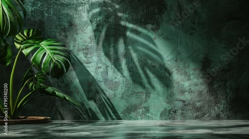 Empty table with monstera leaves on dark green shadow texture wall background. generative AI image