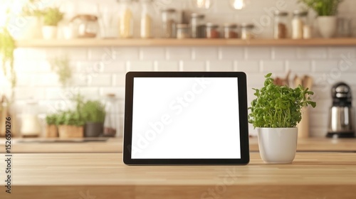 Empty Tablet on Kitchen Countertop with Fresh Herbs