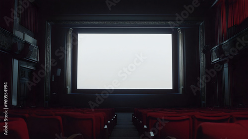 Empty Theater Scene: A Blank Screen and Projector Await the Premiere of a New Movie in the Red Chair Auditorium Nobody Mock-up Template