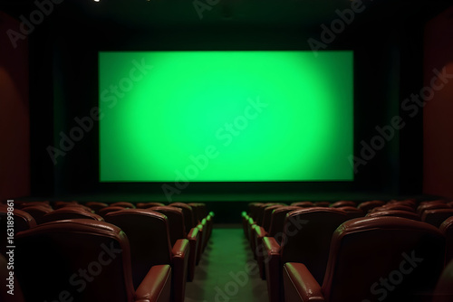 Empty Theater Seats Facing a Bright Green Screen Ready for a Show