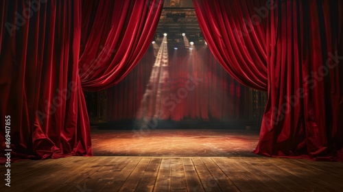 Empty theater stage with red curtains and spotlight