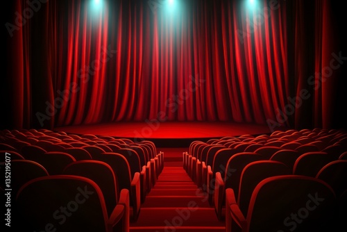 Empty Theater with Red Velvet Curtains and Seats for Performance
