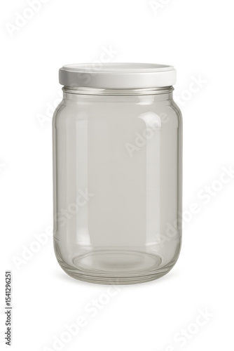 Empty transparent glass jar with a white screw cap lid, isolated on a white background, ideal for packaging, food storage, kitchen use, DIY crafts, preservation, and product mockup design purposes.