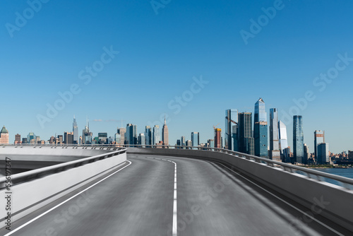 Empty urban asphalt road exterior with city buildings background. New modern highway concrete construction. Concept of way to success. Transportation logistic industry fast delivery. New York. USA.