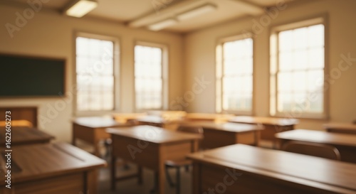 Empty Vintage Classroom With Wooden Furniture And Sunlight, Blurred Background
