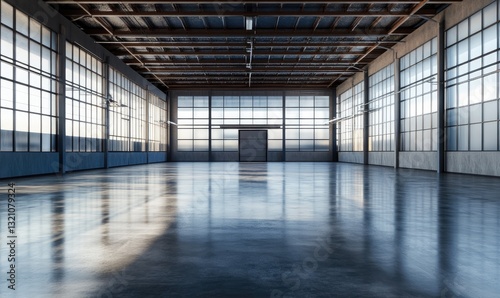 Empty warehouse interior, bright, modern. Spacious, industrial, sleek