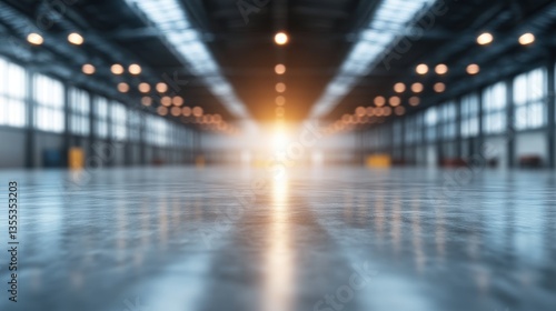 Empty Warehouse Interior with Polished Floor and Blurred Background.