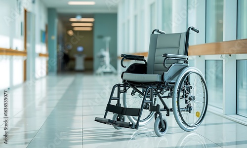 Empty Wheelchair in a Bright Hospital Corridor with a Reflective Tiled Floor