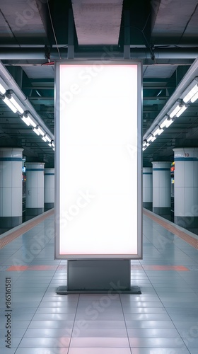 Empty white advertising billboard in a modern subway station, perfect for urban promotions and transportation ads. High-quality stock photo.