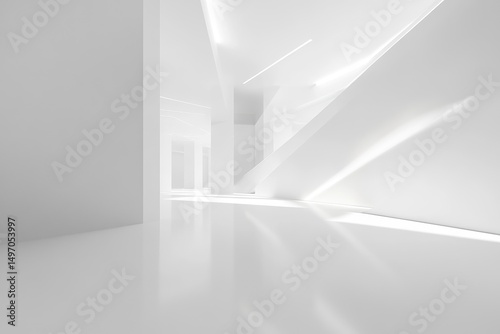 Empty white architectural space with geometric forms
