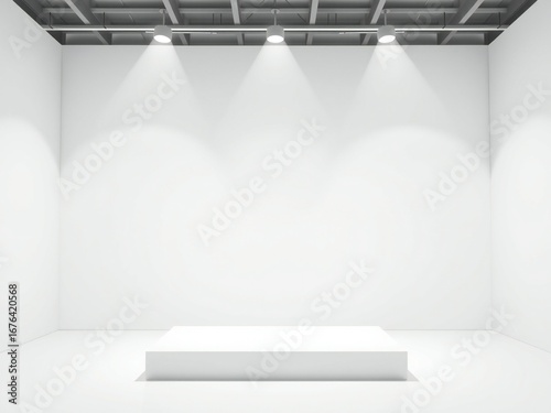 Empty white exhibition space with spotlighted display podium and ceiling lights