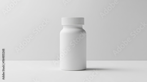 empty white pill bottle with no label. The bottle should be placed on a clean white surface without any other distractions.