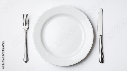 Empty White Plate with Fork and Knife on Clean Table Setting
