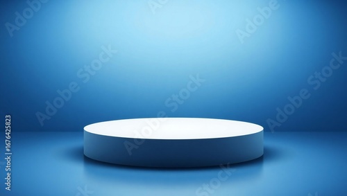 Empty white podium with blue spotlight on a reflective floor