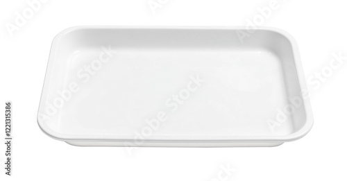 Empty white rectangular ceramic baking dish on white background