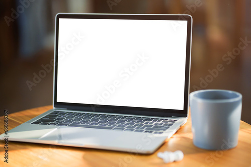 Empty white screen laptop. blank white screen. Mockup image in office