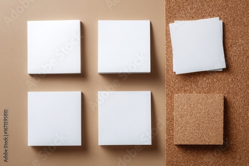 Empty white sticky notes arranged in two rows of three on a cork bulletin board, ideal for planning, reminders, or presentations.