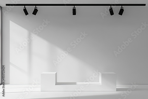 Empty white studio background with light grey flashlights providing a space for your text Spotlights illuminate a blank white wall