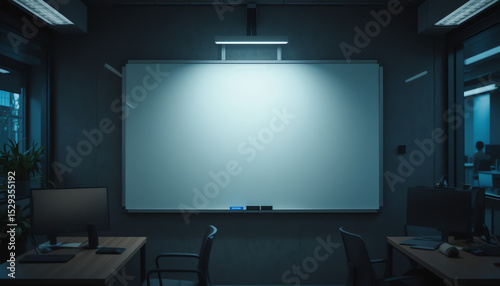 Empty whiteboard illuminated in modern office space with blurred video background ambience